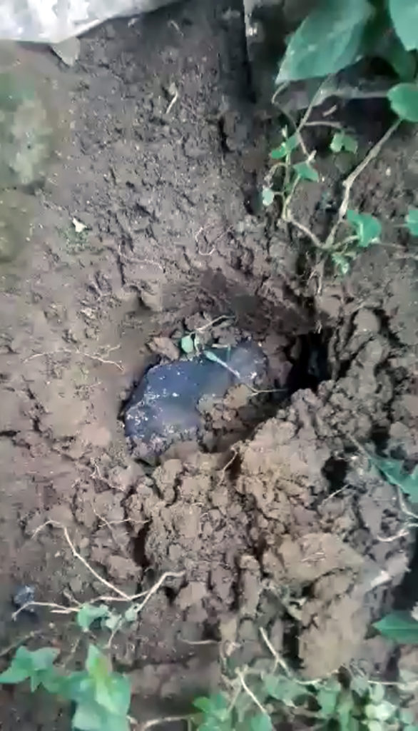 The 2.4-kilogram meteorite at its fall location below the roof. The video was filmed by Mr Josua Hutagalung about 40 to 50 minutes after the fall of the meteorite and shows Mrs Mardiani Hutabarat about to dig it out with a hoe in the presence of her children. Video: Josua Hutagalung (1 August 2020)