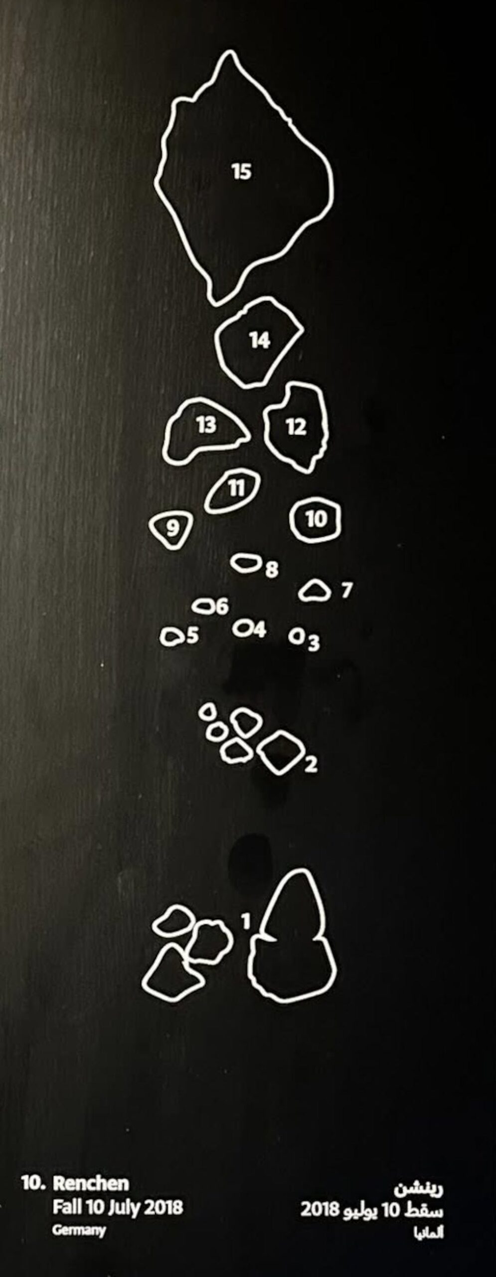 The second find (Renchen-2 (main mass), 955 g)On 30 July around noon Pavel Spurný transferred another map of the part of the strewn field where larger masses were expected to have fallen to Sporn and Neuhofer who had returned to the strewn field for their third search campaign on 29 July. On 31 July Ralph Sporn and Martin Neuhofer found a large mass of 955 grams with broken faces next to a small shallow impact pit on a meadow near the Heuweg, east of Holchenbach in the south of the communal district Rheinau between the forests Korker Wald and Hürbewald about ~5.4 km north-west of Renchen. The locations of Renchen-1 and Renchen-2 were used by Dr Spurný to refine his strewn field calculation by 8 August 2018. Radio nuclides of the specimen have been measured at Max-Planck-Institut für Kernphysik (MPIK) in Heidelberg. The soil around and including the impact hole has been cut out and saved by the finders, similar to what has recently been done with the impact pits of the Stubenberg and Mangui falls. Later the finders sold the main mass to Abu Dhabi where it is exhibited in the new Museum of Natural History.