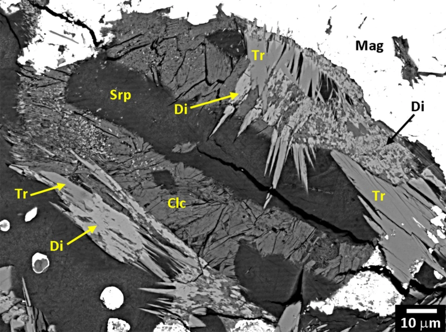 Brighter areas represent higher atomic numbers. Some textural relationships between tremolite (Tr), clinochlore (Clc), diopside (Di), serpentine (Srp), and magnetite (Mag) can be seen. Diopside commonly occurs in patchy/porous textures indicating that it is being resorbed to produce well-formed crystals of tremolite. Serpentine and clinochlore also are cut by tremolite and diopside, further supporting a prograde reaction.