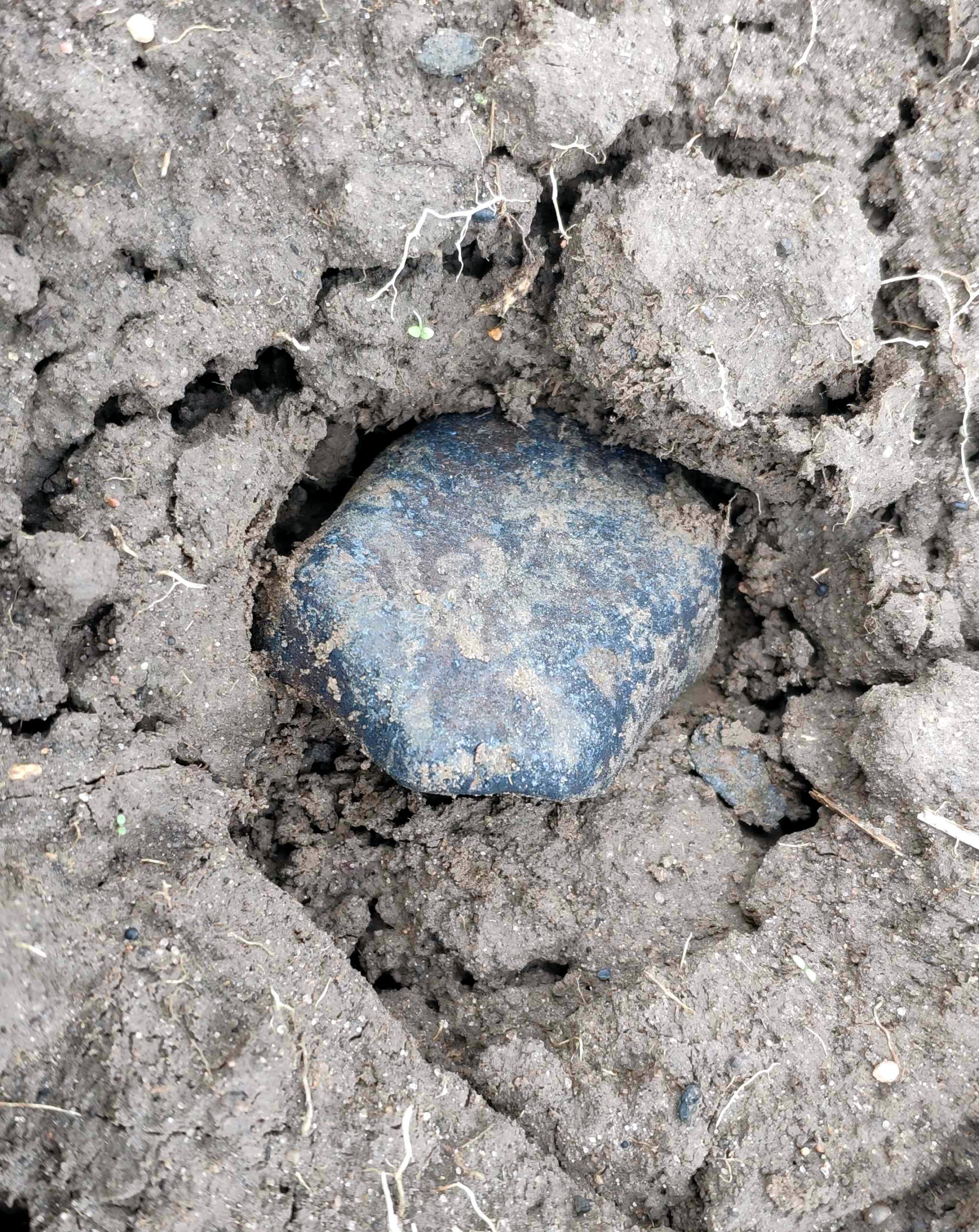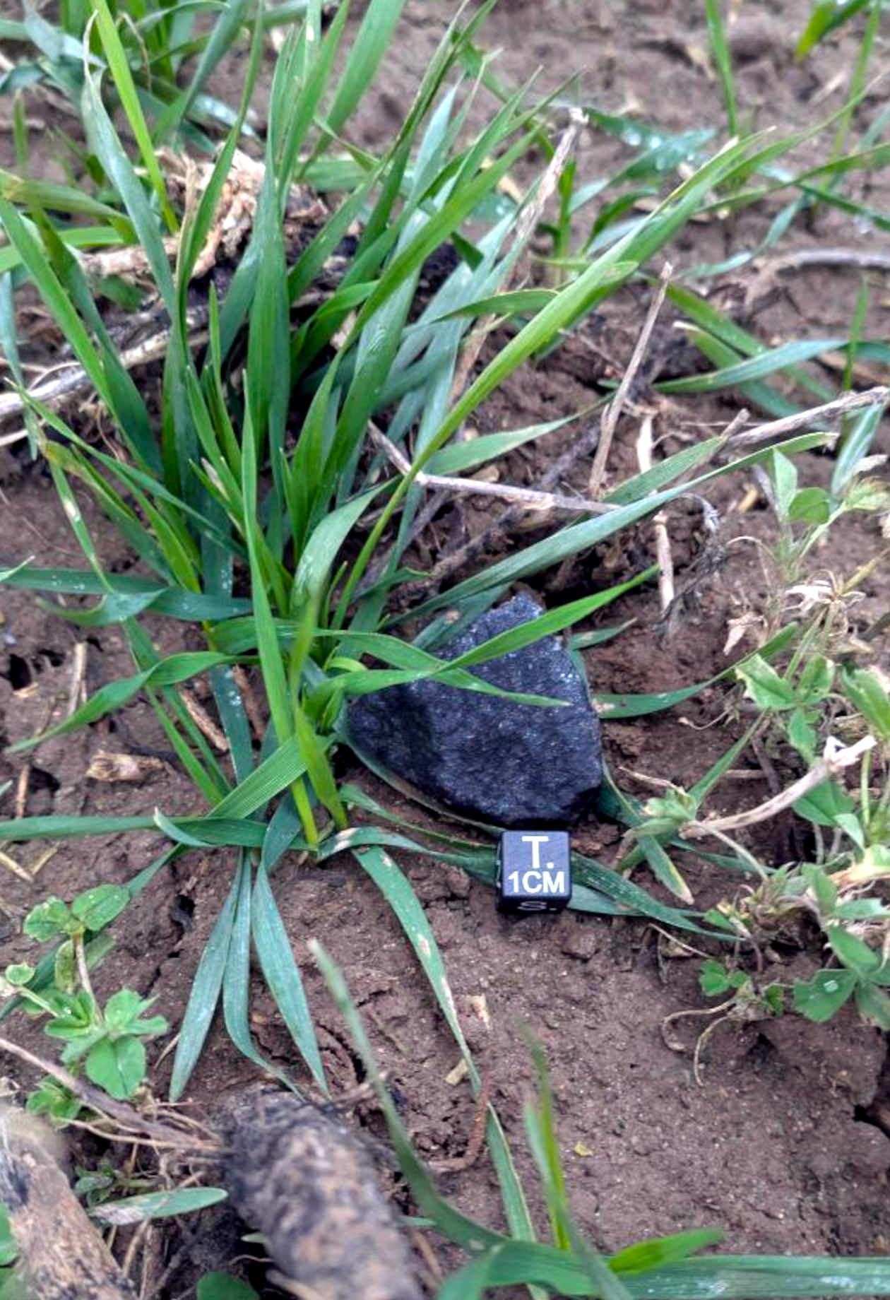 An authentic looking meteorite mass in situ. It seems to be the 31-gram one which was found by Alexander Pastukhovich at location 54°01’24.3″N, 28°07’58.3″E, east of Ryabyi Slup, on 26 January 2025. Photo: UrFU