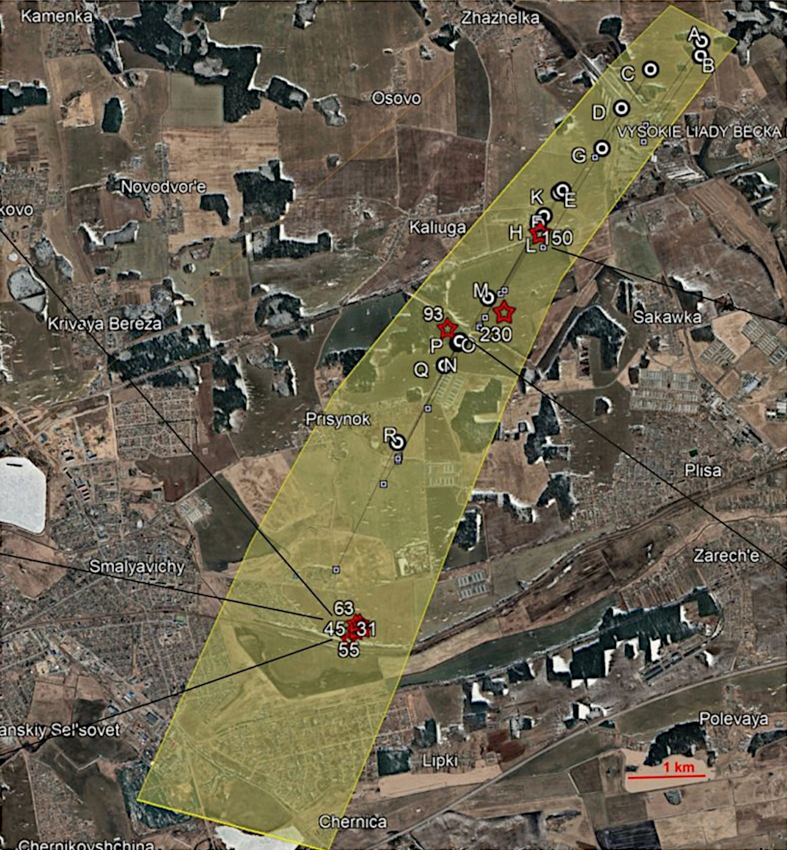 The calculated ~10-km² fall area with the fall locations of some of the found meteorites. Image: Czech Academy of Sciences / Minsk Planetarium