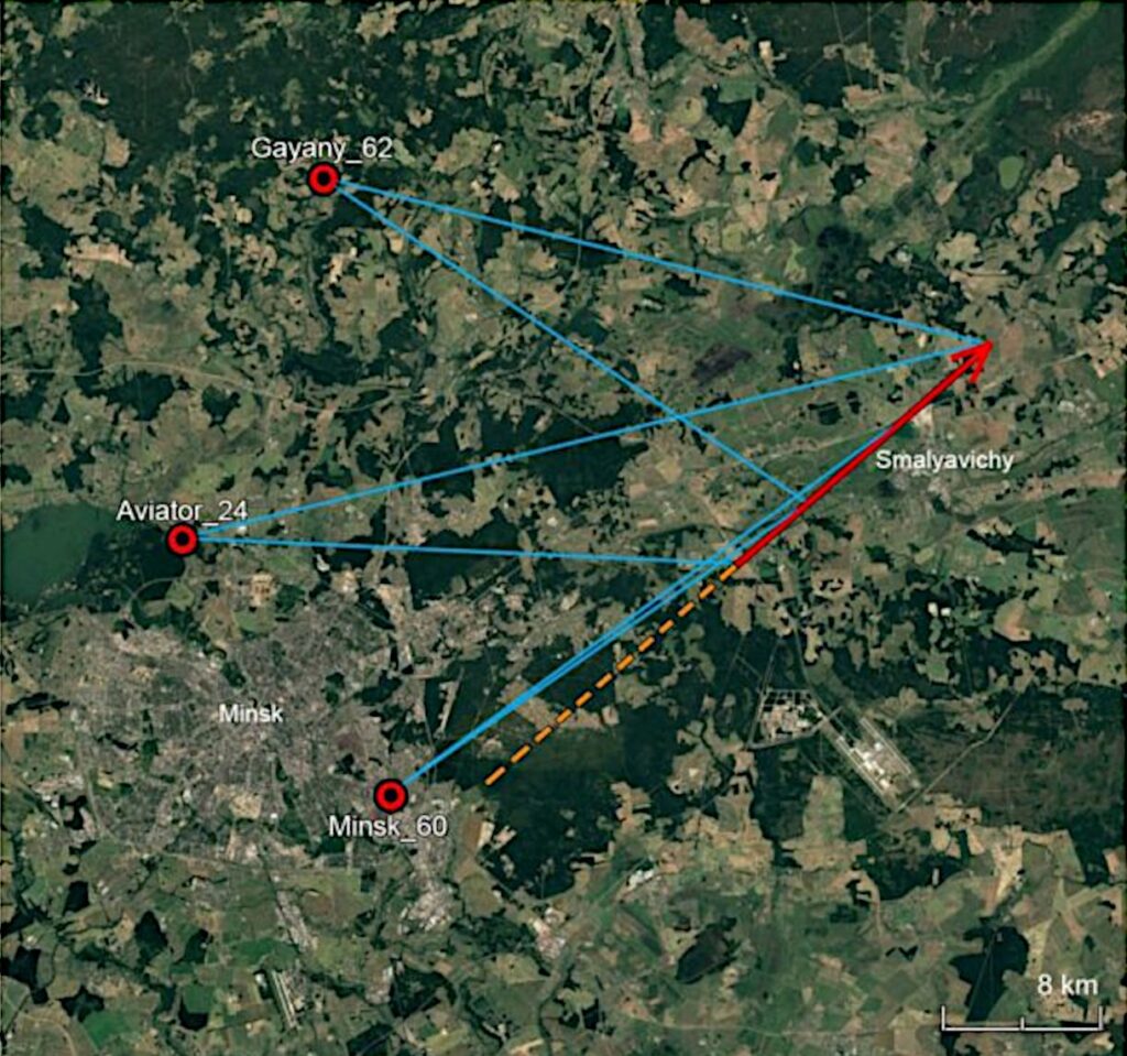 The bolide heading in northeastern direction, recorded by three cameras (Gayany, Minsk and Aviator) of the Belarusian camera network. The three cameras caught only the second part of the luminous trail down from an altitude of 48 kilometres and the last fragment was detected at an altitude of 19.8 kilometres above the village Žaželka. Video: Minsk Planetarium