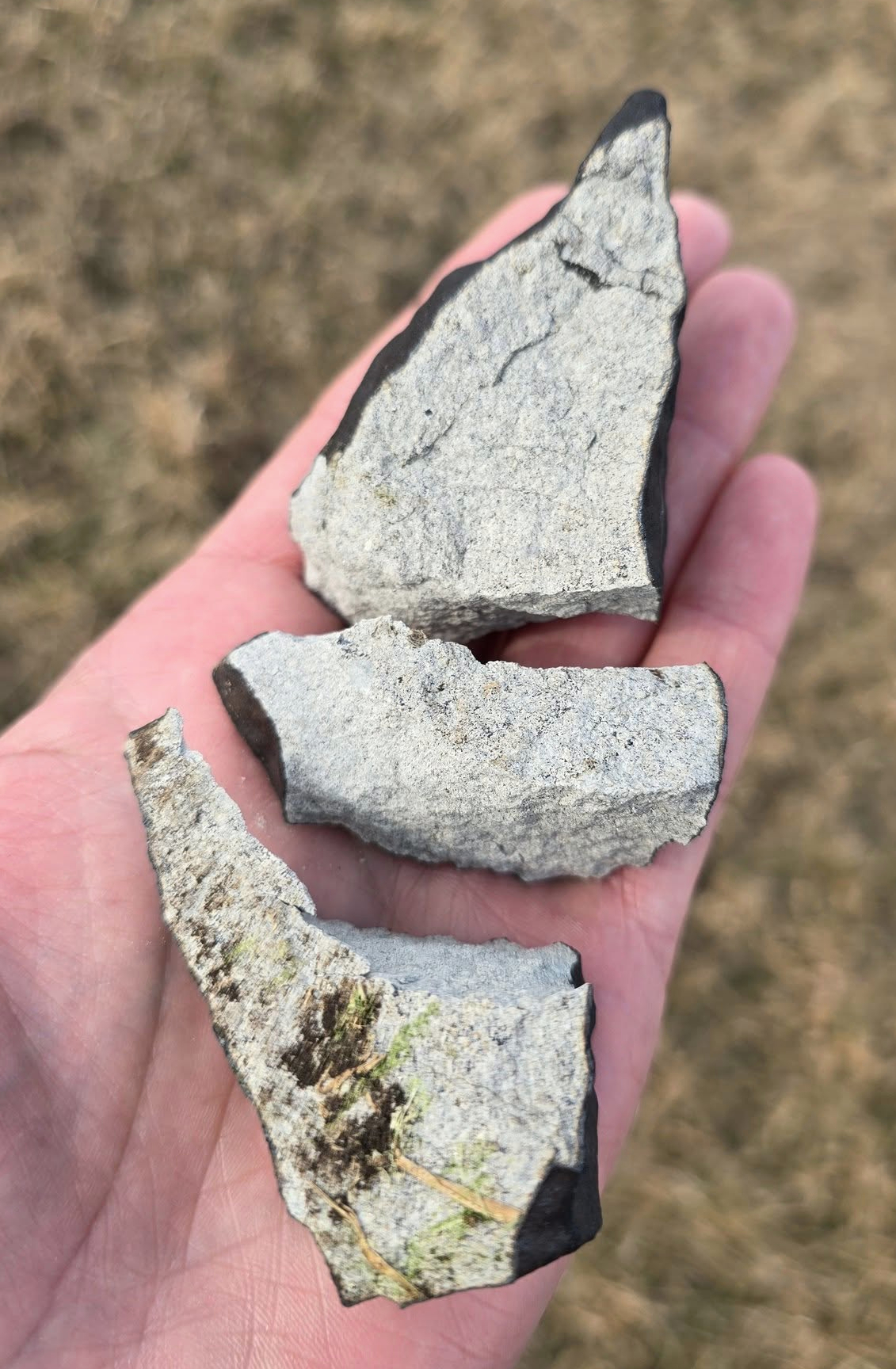 Three fragments of one mass (46.24 g) found on 3 March 2025, ~43g Andrzej Owczarzak (left), ~3g Filip Nikodem (right). Photos: Filip Nikodem, Andrzej Owczarzak
