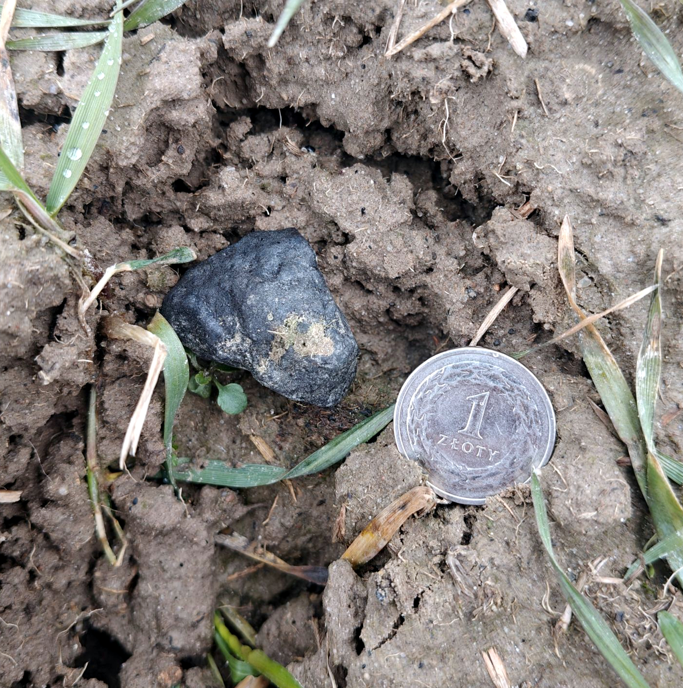The first meteorite (92.8 g, dry) was found by Maksymilian Jakubczak at 10:10 (CET) on 22 February 2025. At 12:30 (CET) on the same day a 257.4-gram mass was found by Krzysztof Oleszczuk and a 48.02-gram specimen by Wojciech Burzyński in or near the Drelów commune in the Biała Podlaska district. The 257.4-gram mass has been sent to the National Center for Nuclear Research (NCBJ) for short-lived radioisotope analysis. On 23 February at 9:20 CET a fourth specimen weighing 293.2 grams was found by Daria Klimek and Mariusz Krall and at 12:30 CET a 517.07-gram specimen was found by Wiktor Hajwos, son of the SN21 station operator, as member of the search group together with Marcin Hajwos (SN14 station), Artur Jaśkiewicz (SN33 station), Dariusz Skierski, and Mateusz Zmija (SN01 station). The 517.07-gram specimen has been sent to the National Centre for Nuclear Research (NCBJ) in Otwock in Poland for short-lived radioisotope analysis. More meteorites were found on 23 February 2025, including a 25.59-gram specimen, found at 15:55 (CET) by Gabriela Najman, a 44.5-gram mass found by Marcin Żywczak and a 104-gram fragment found by Piotr Poćwierz. On 24 February Paweł Walczak (SN12 station) found a 23-gram mass while searching together with his teen son and Mateusz Żmija. It has been sent to the Rzeszów University of Technology for analysis. On the same day at ~15:00 CET a ~28-gram specimen was found by the team Filip Nikodem, Michał Nebelski and Andrzej Owczarzak. Furthermore, two additional masses were found on 24 February. Tomasz Żywczak found a 26.5-gram specimen and Kryspin Kmieciak found a 77-gram mass, of which 23.73 grams (in three fragments) as type specimen have been sent to the Faculty of Natural Sciences, University of Silesia in Katowice for analyses. On 25 February Sylwester Wojda found a 462-gram specimen and Jarosław Morys (SN02 station) found a 115-gram specimen which has been sent to sent to Institute of Nuclear Physics of the Polish Academy of Sciences (IFJ PAN) in Kraków). On the same day Dr. Zoltán Balla found a 179-gram mass accompanied by Biró Zsófia and Kővágó Gábor. On 26 February the following finds were reportedly made: 32 grams by Arek Bingoraj, 62 g by Jarosław Morys (also sent to Institute of Nuclear Physics of the Polish Academy of Sciences (IFJ PAN) in Kraków), 33.95 g (at 14:09 CET) by Szymon Kozłowski and Rafał Mąka, 18 g by Andrzej Owczarzak, 66.6 by Michał Nebelski, 290 g in three fragments by Kryspin Kmieciak and 58 g by Filip Nikodem. On 27 February 2025 these masses were reportedly found: 35 g by Wojciech Jachymek, 47 g by Leon Thann, 17 g by Daria Klimek and Mariusz Krall and 105 g by Marcin Pietryszyk. On 28 February Michał Nebelski found a 64-gram fragment, Paweł Zaręba found an 18.48-gram specimen and Martyna Motylska found a 23 gram mass. On 1 March Filip Nikodem found an 18-gram specimen accompanied by Andrzej Owczarzak and Michał Nebelski. On 2 March Marek Nikodem found a 16-gram specimen and on 3 March a ~10-gram specimen was found by Andrzej Owczarzak. On the same day Leon Thann found a 22-gram fragment and Filip Nikodem (~3g) and Andrzej Owczarzak (two fragments weighing ~43g) found three fragments of a ~46.24-gram mass. On 4 March Michał Nebelski found a 4.9-gram specimen and Jarosław Morys found a ~10-gram mass. On the same day two other finds were made: 8.735 g by Andrzej Owczarzak and 14.12 g by Aleksander Błasiak. The following finds were made on 5 March 2025: 3.65 g by Mateusz Żmija, 40.92 g by Patryk Kosałka and Oliwia Winnik, 40 g by Tomasz ‘Aurora’ Żywczak. On 6 March Filip Nikodem found a 93-gram fragment which fits perfectly to the 40.92-gram fragment found by Patryk Kosałka and Oliwia Winnik, which is exhibited at Jagiellonian University’s Nature Education Center. On the same day Andrzej Owczarzak found a 7.5-gram specimen and Gabriela Najman found a 1.1-gram specimen at 10:30 CET. On 7 March Michał Nebelski found a 31-gram mass. On 8 March Marcin Hajwos’s wife Adrianna Hajwos found a 14.4-gram specimen. Furthermore this find has been reported online: 3.6 g by Maciej Łabęcki. Analyses for a classification of this meteorite fall are being performed at the University of Silesia in Katowice, and at the Faculty of Natural Sciences, by Prof. Krzysztof Szopa and Agnieszka Mirek.