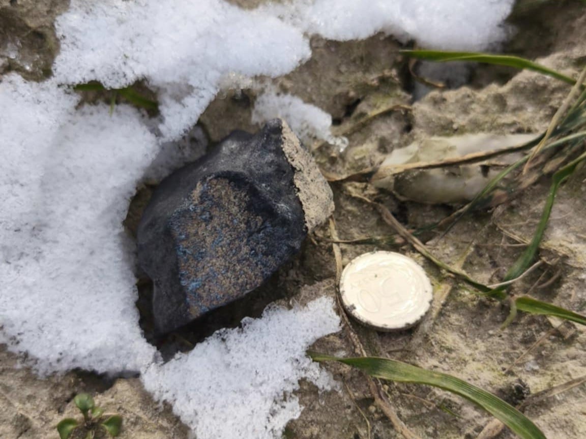 290-gram, three pieces which fragmented on impact (26 February 2025, Kryspin Kmieciak). The three fragments perfectly fit to the 179-gram fragment found on 25 February 2025 by Zoltán Balla about 500 metres away (see above).