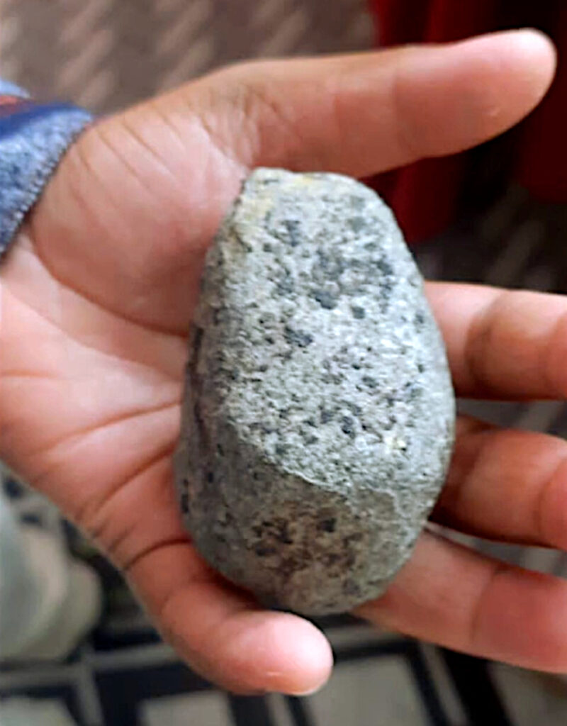 Three meteorite masses or fragments (L4/5, S3) have been found in Khalwat Limgaon (खालवत लिमगाव or खवळट लिमगाव) around location 19°06’19.2″N, 76°04’55.1″E at three fall sites in the village. One mass (282 g, 7.8 cm long, 4.9 cm wide) pierced the tin-shed roof of 38-year old farmer Ramdas Bhikaji Ambure’s courtyard. According to Ramdas Bhikaji Ambure/Bhikaji Ambhore/Bhikaji Gyanoba Ambhore (भिकाजी ज्ञानोबा अंबुरे) the women of the household were sitting outside of their house while eating when they and other villagers heard three loud booms in the sky. According to some villagers it happened between 14:00 and 14:20 IST (Indian Standard Time). Reports say that at that moment Ramdas Bhikaji Ambure was worshipping in the village temple until his wife called him in fear because his 9-year-old son Atharva was injured by a cement slab during an impact on their roof. When he went into the house he saw the hole in the tin roof. A clay stove was also hit by the meteorite. The found mass reportedly felt very cool when it was touched first. According to Bhikaji Gyanoba Ambure two other masses have fallen in the village as well. One intact meteorite (or a fragment of the mass which pierced the roof) fell on the roof of the Ambhore family’s house as well, bounced off and then fell on the village road next to it. This mass or fragment later was broken open by Ambure to see how it locked inside. A third mass fell on a barren field very close to location ~ 19°06’13.0″N 76°04’43.2″E where some children were playing cricket at the time of the fall. This concrete impact on the ground of the field and the booms of the fragmenting meteoroid before were witnessed by these children playing in the field. According to the children the meteorite mass which fell on the field was ‘burning hot’ when they picked it up shortly after the fall. The two larger masses were handed over to the Beed district administration. According to Bhikaji Ambhore, shortly after the meteorites fell everyone got scared, then other villagers came to know what had happened. The villagers were initially afraid that more meteorites might fall during the following night and some did not sleep that night. On 5 March 2025 the director Dr Shriniwas Aundhkar and Abhinav Vitekar from APJ Abdul Kalam Astronomy and Space Science Center in Sambhajinagar (Aurangabad) arrived at the fall site to inspect the meteorites. The meteorite, which pierced Ambure’s roof, and the one which hit the field both show some patches of fusion crust. They were taken into custody by scientists and then sent to the Geological Survey of India in Kolkata where they have been analysed scientifically. The third mass or fragment which ended up on the village road was not handed over to the scientists, because the finder had broken it into four fragments to take them to local temples. On 14 May 2025 it was reported that this meteorite mass or fragment was in fact missing. Apparently the family lost track of it while dealing with curious neighbours and the media rush this fall has caused. Ambhore regrets having given the other meteorites to the government officer since only later he learned about the material value of these meteorites. The family has not received any financial compensation for the removal of their meteorites. They later contacted the district collector’s office to try to get the meteorites which they had submitted back, but their request was denied.