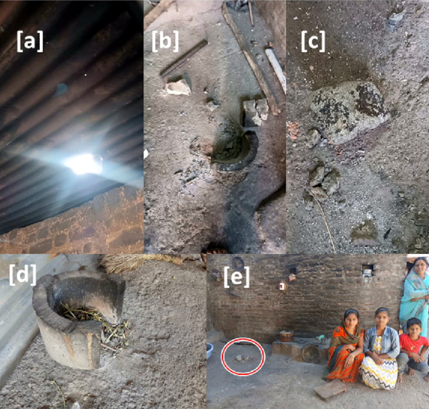 Image: (a) Hole on the kitchen tin roof. (b) Broken pieces of the clay stove. (c) The major mass that fell inside the house that broke the clay stove. (d) An intact clay stove (shown for recreation) used by the villagers. (e) The impact zone marked by a red circle, where a clay stove was present and the exact place where the members of the house were present in the kitchen at the time of impact. Image from ‘short communication’ in Journal of the Geological Society of India, Volume 101, Number 10, 01 October 2025