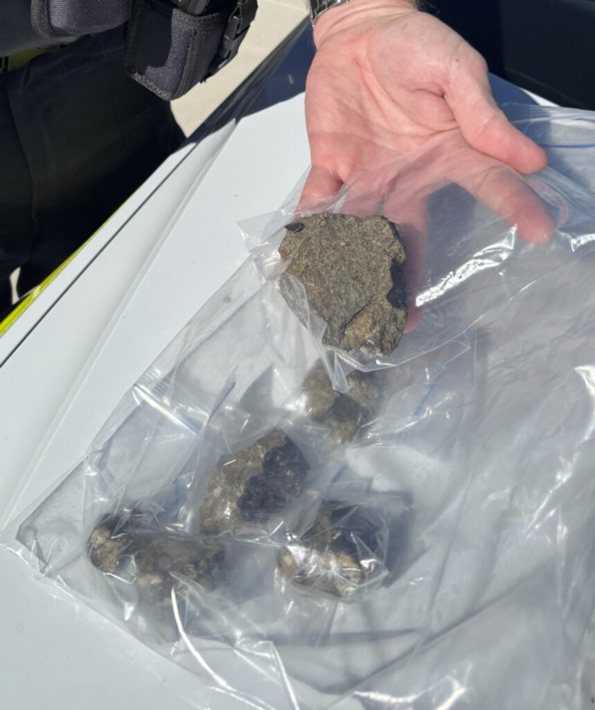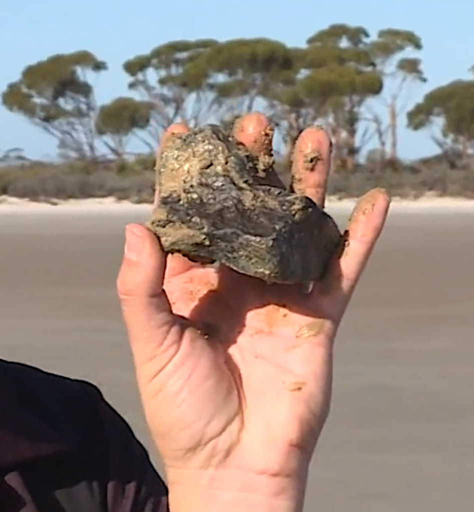 Marcus Scott presenting six larger fragments of his find to colleagues. Photo: Marcus Scott/Ravensthorpe Police (19 May 2025)