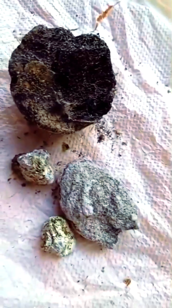 Electrical engineer Ramires Lopes (27), the niece of the farm owner, reports that her aunt was home alone at the time of the fall. She reportedly was inside the house to make lunch when she heard really loud bang coming from outside. When she went out, she found the frightened chickens, horses and cows and thick dust in the air near the corral. On the ground she could see the damaged concrete and the broken corral roof. She was very scared at the time. The aunt found four objects near the corral: one larger, darker and burned-looking one, and three smaller ones. According to the finder the stones were reportedly still ‘lukewarm’ when touched first. She took them into the house and put them on a table. At least one fragment has been exposed to a household magnet, which reportedly did not attract. Later Ramires Lopez took the found objects. They were handed over to Universidade Federal de Juiz de Fora (UFJF) and were first analysed for their elements with a handheld Tracer XRF spectrometer by Maria Elizabeth Zucolotto on 6 August 2025. According to Zucolotto the dark object found is a burned bone fragment but some of the other three objects could, according to her, potentially be meteorites (enstatite chondrites or aubrites), since at least one contains nickel. Zucolotto also visited the reported fall site and found another nickel-containing fragment on the roof of the corral. More analyses of their elemental composition in a laboratory at UFJF and Cefet/RJ were performed because data by a handheld XRF device are in general not sufficient to confim the meteoritic nature of a rock. A terrestrial origin was most likely and was eventually confirmed on 8 August 2025 BRT. The aunt and family members of the farm prefer to remain anonymous. The alleged fall event was recorded by a security camera.
