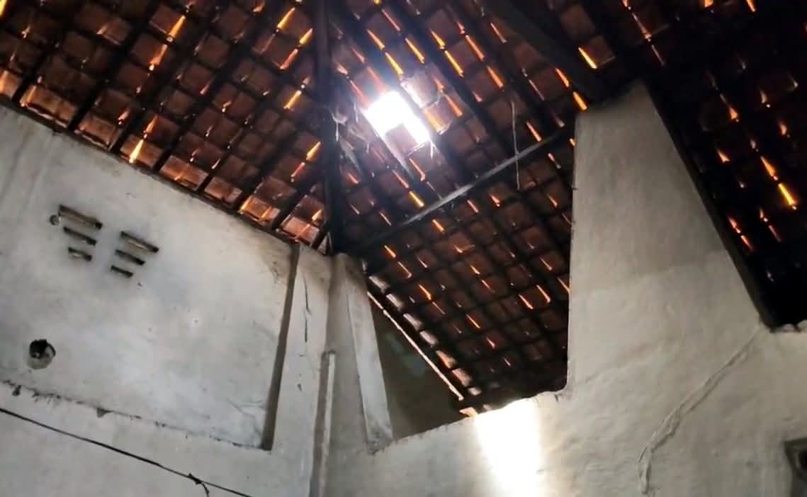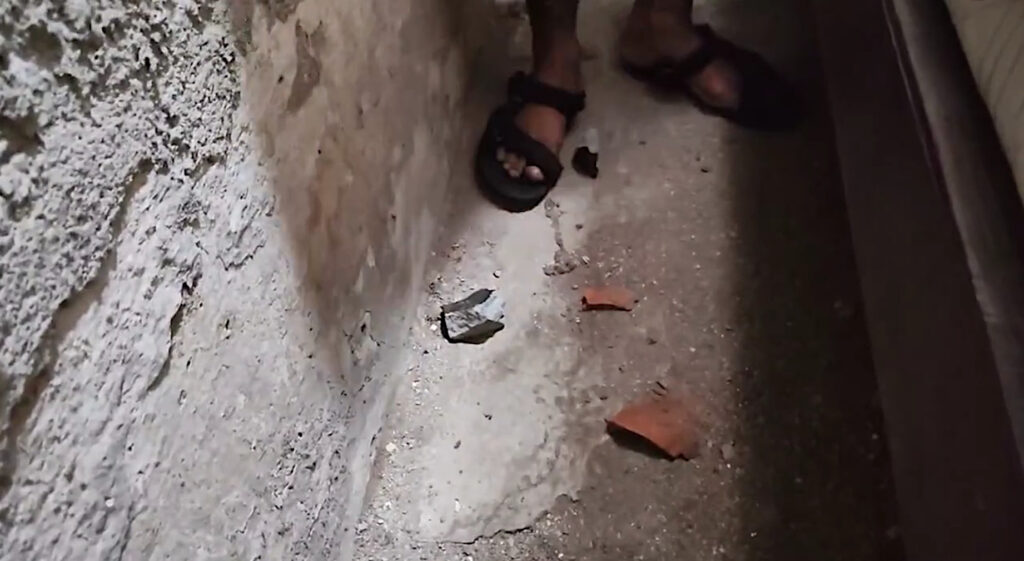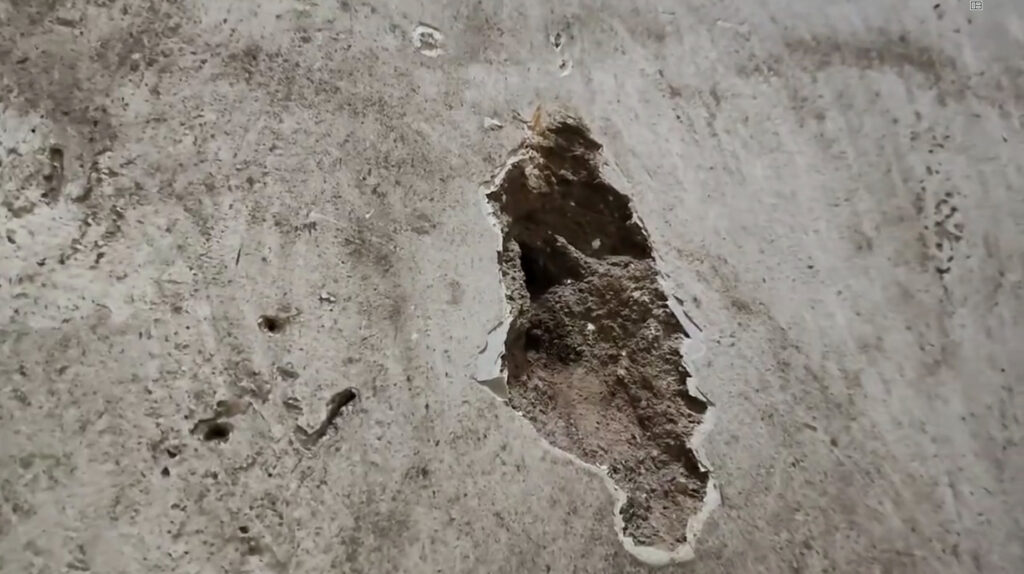 Hole in wall which the meteorite or falling roof tiles reportedly caused. Photo from video published by J. Collins