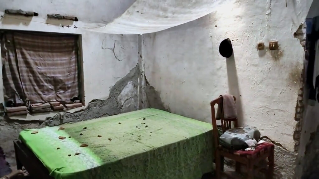 Space between the bed and the impacted wall with two of the larger fragments on the ground. Photo from video published by J. Collins