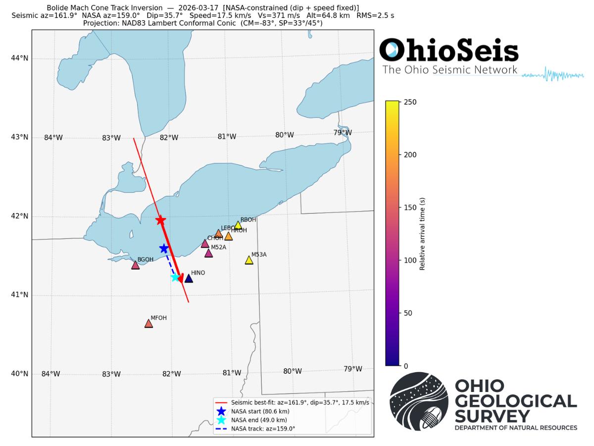 Map showing the calculated trajectory (red line) as calculated from OhioSeis seismic stations, with symbols marking seismic stations that recorded the sonic boom. The seismic trajectory closely matches NASA’s satellite derived path. (Image: Ohio Geological Survey)