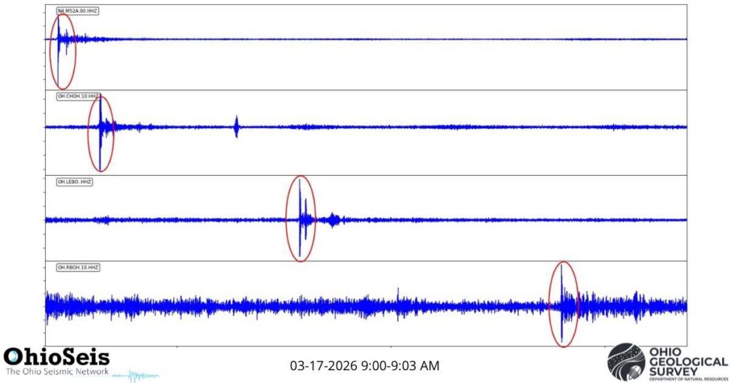 The nontectonic (non-earthquake) signal captured at stations in Chesterland, Chagrin River Park, Lake Erie Bluffs, and Red Brook Metropark. The signal reached each station at slightly different times depending on how far it was from the meteor’s path. Image: Ohio Seismic Network (OhioSeis)