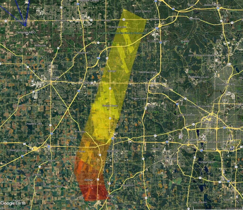 NASA’S calculated fall area: Red shows where ~10kg meteorites would land if this fall produced any. Dark orange is ~1kg, orange is ~100g, light orange is ~10g, and yellow is ~1g and smaller. Image: NASA