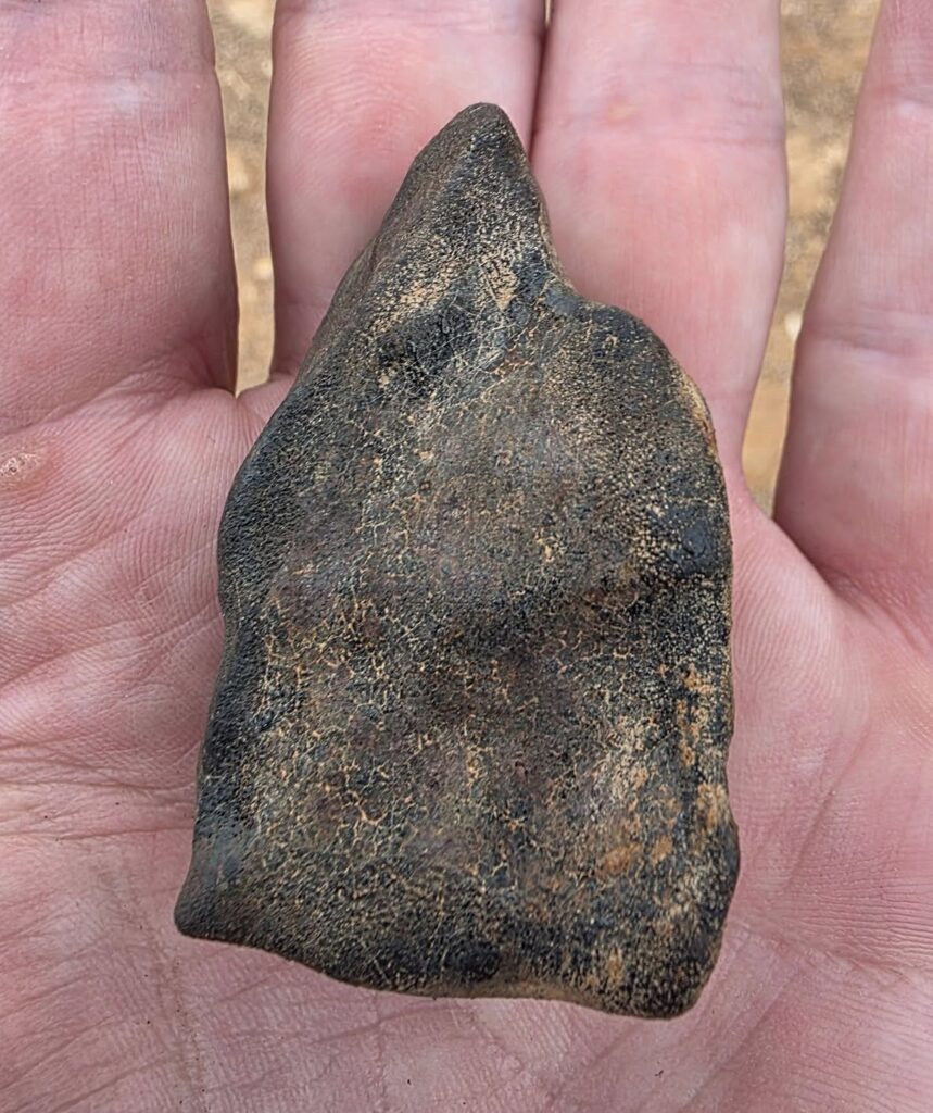 The 1.072-kilogram ‘Madura Cave’ meteorite of a fall on 19 June 2020 found only twenty days after its fall at a location south of the Eyre Highway on an old telegraph track near Madura Cave. It was found rather by accident by astronomer Dr Hadrien Devillepoix and planetary geologist Dr Anthony Lagain after only two hours during a recon mission to assess the latest calculated fall area near Madura. Photo: Hadrien Devillepoix